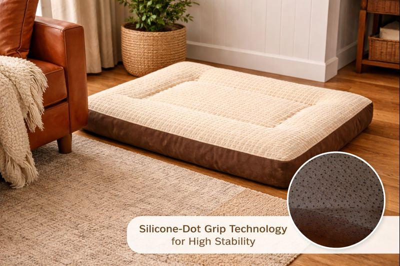 Our proprietary Silicone-Dot Grip Technology creates high-friction stability on smooth surfaces. Whether it's a leather sectional, a car backseat, or a polished wood floor, this bed stays exactly where you put it.